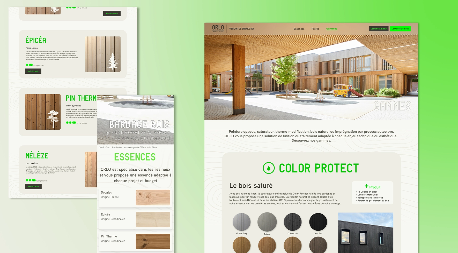 Orlo est un industriel du bois spécialisé dans le bardage bois, des solutions durables à destination des professionnels du bâtiment. L’enjeu du site était de positionner clairement la marque comme un partenaire technique de référence, capable d’accompagner architectes, maîtres d’ouvrage et négoces grâce à une offre lisible et structurée. Le client avait besoin d’un site pour présenter ses gammes (bardage, claire-voie, bois préservé, thermo-modifié, peint ou saturé) de façon pédagogique, en expliquant les usages, les performances et les bénéfices de chaque solution bois. L’objectif était de faciliter le travail de prescription et de choix des matériaux, en donnant rapidement accès aux fiches techniques, aux références de réalisations et aux informations pratiques.